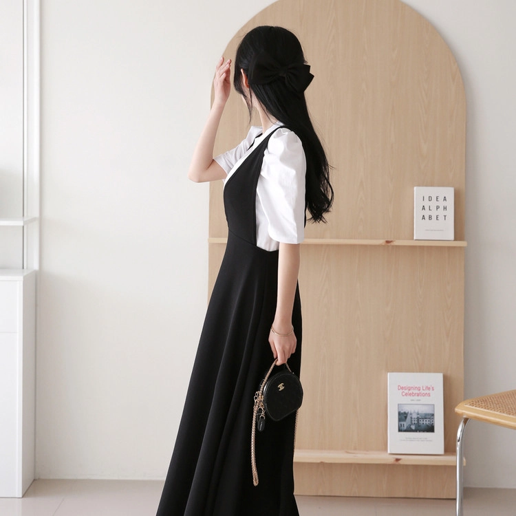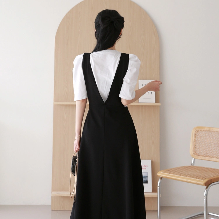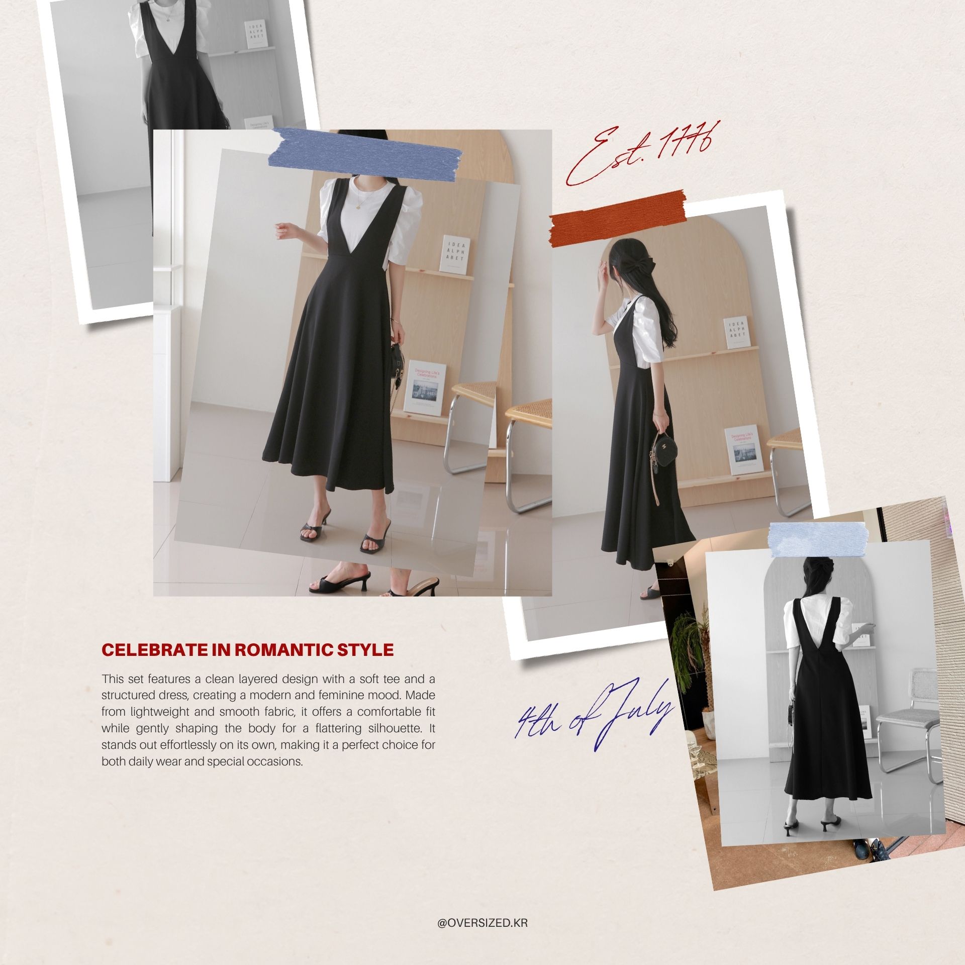 국내 제작으로 완성된, 클래식한 무드의 멜빵 원피스 + 퍼프 티셔츠 세트 🖤