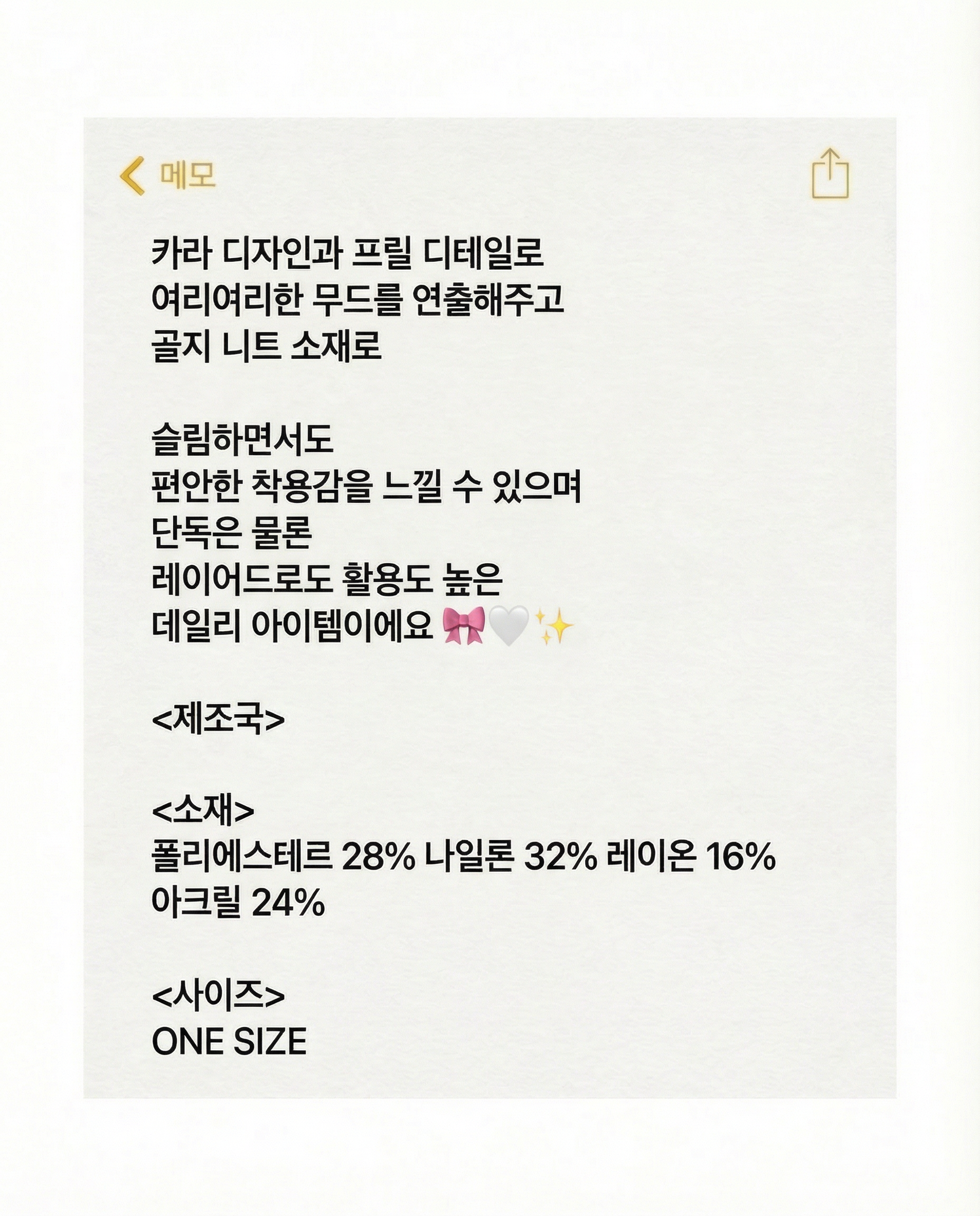 모니터 사양 및 모바일 화면 밝기에 따라 차이가 있을 수 있으며 모델착용컷은 빛, 조명 등에 의해 실제색상과 다를 수 있으며 상품 상세사진이 실제 컬러와 가장 가깝습니다.