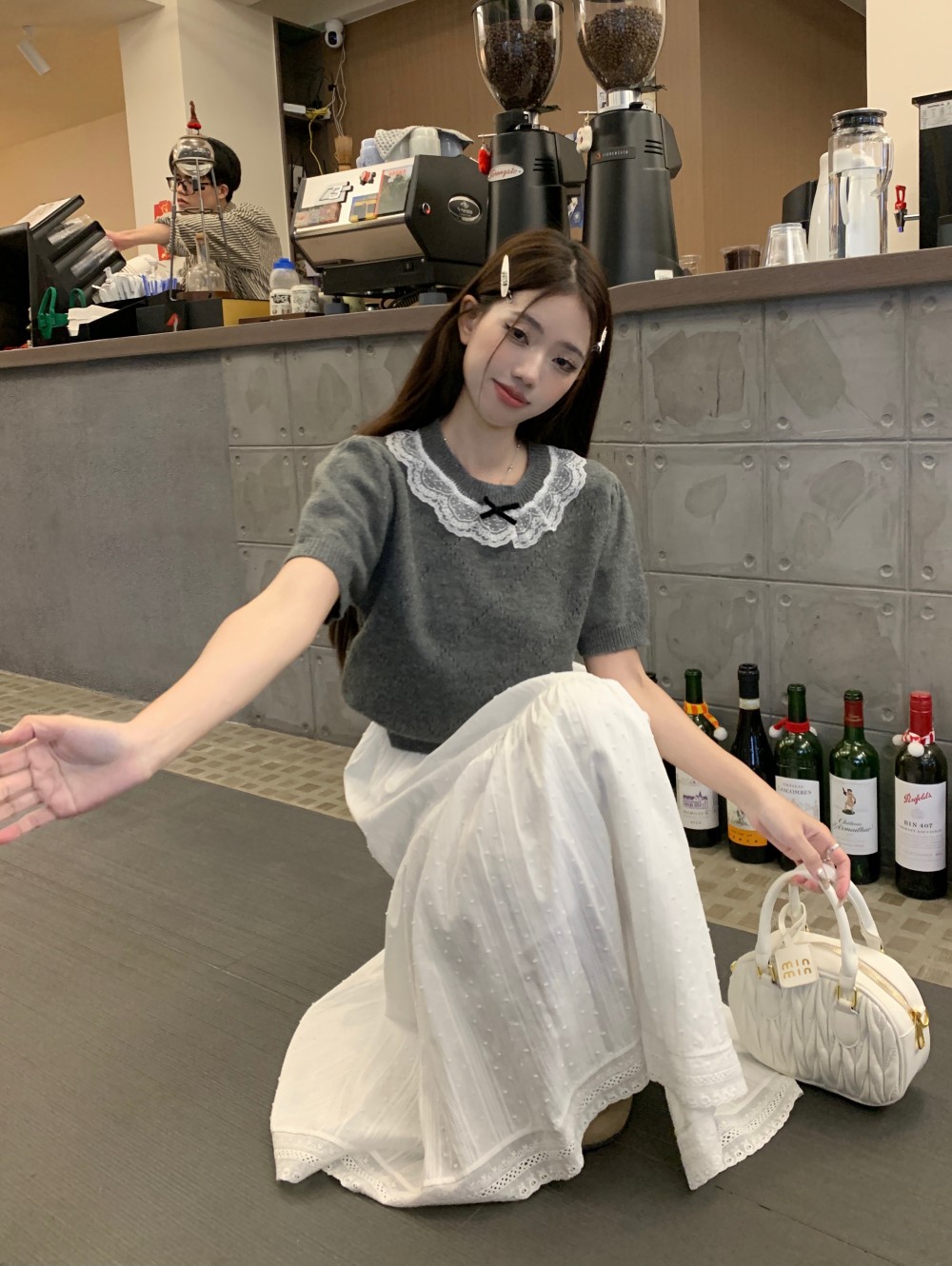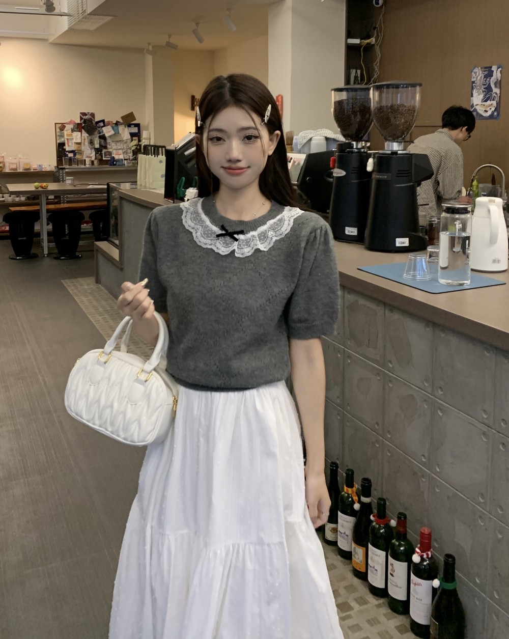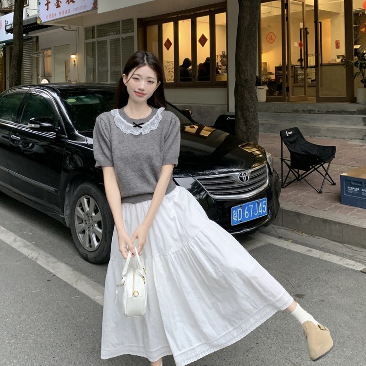• 매력적인 컬러 매치: 소프트 그레이 컬러의 티셔츠와 순백의 롱스커트가 완벽한 조화를 이루어요.
