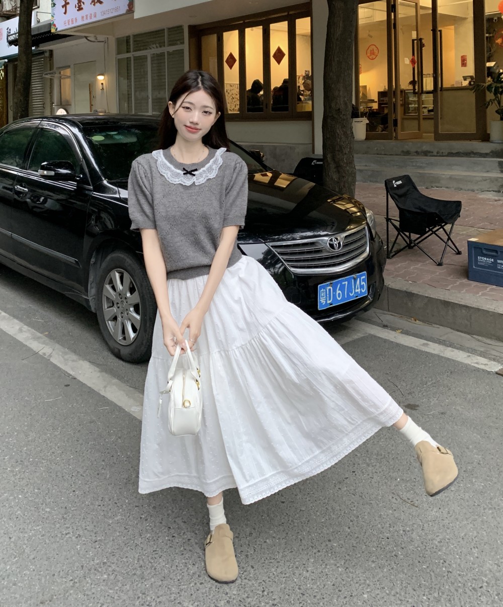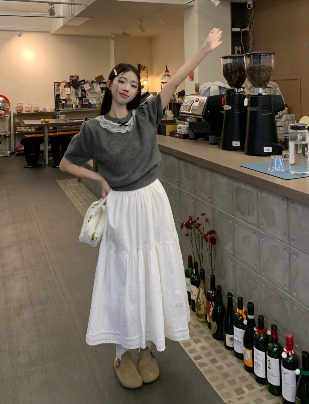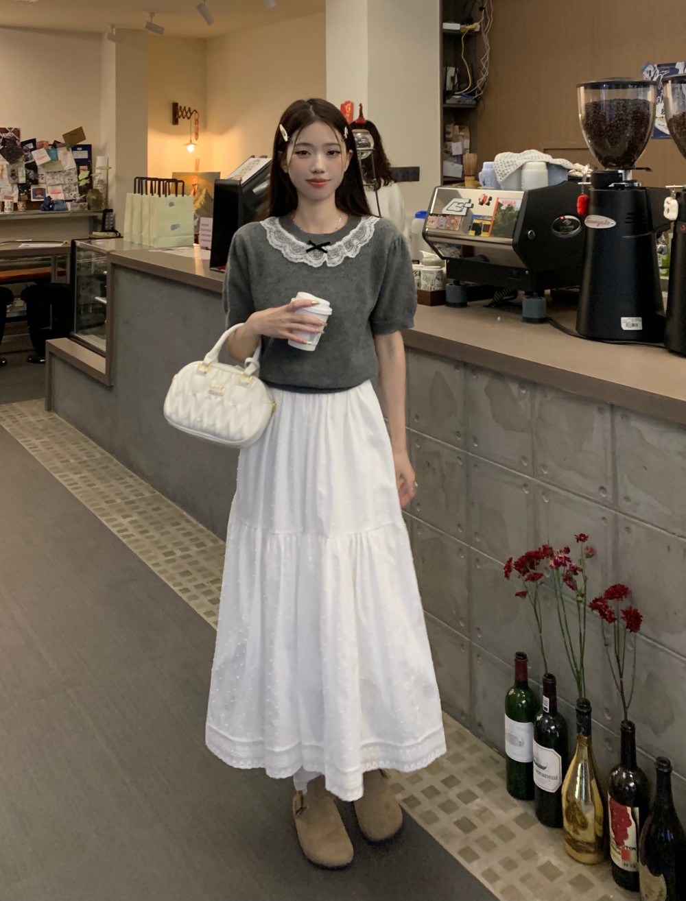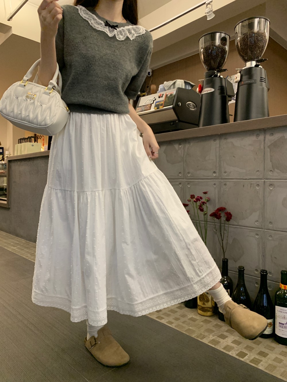 • 여성스러운 롱스커트: 풍성한 실루엣의 화이트 롱스커트가 우아함을 더해줘요.