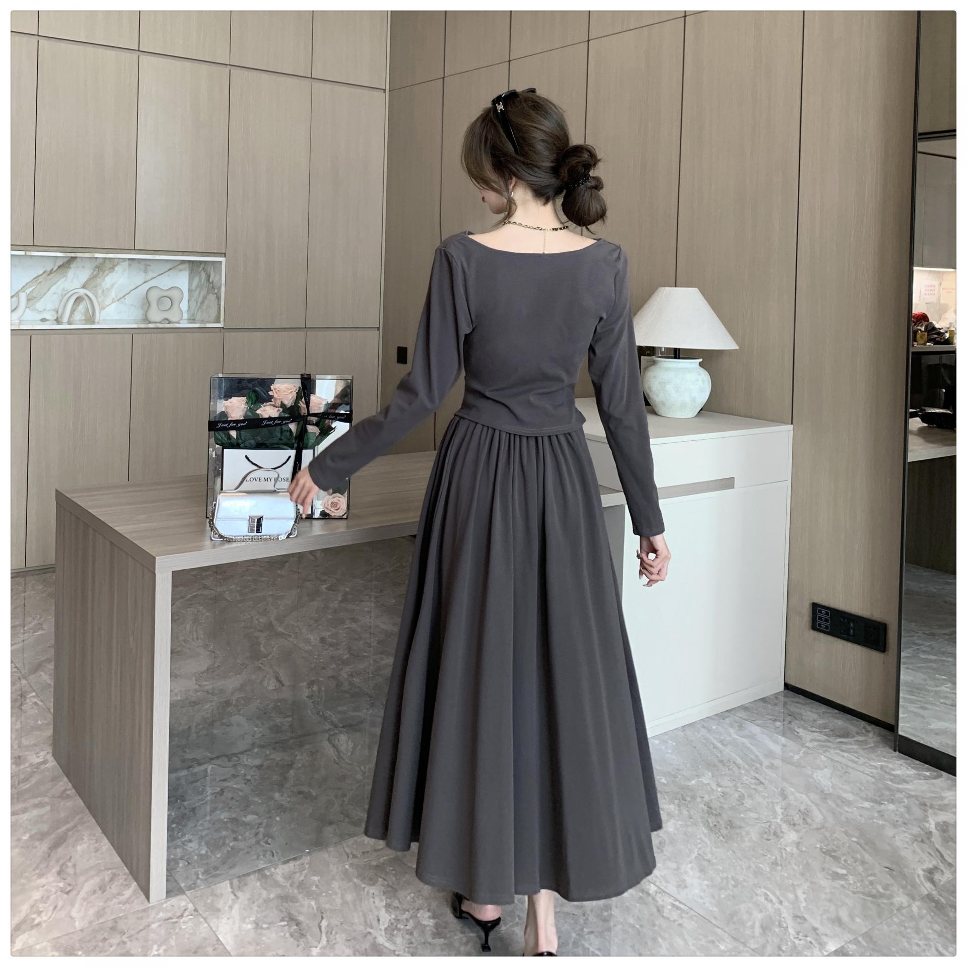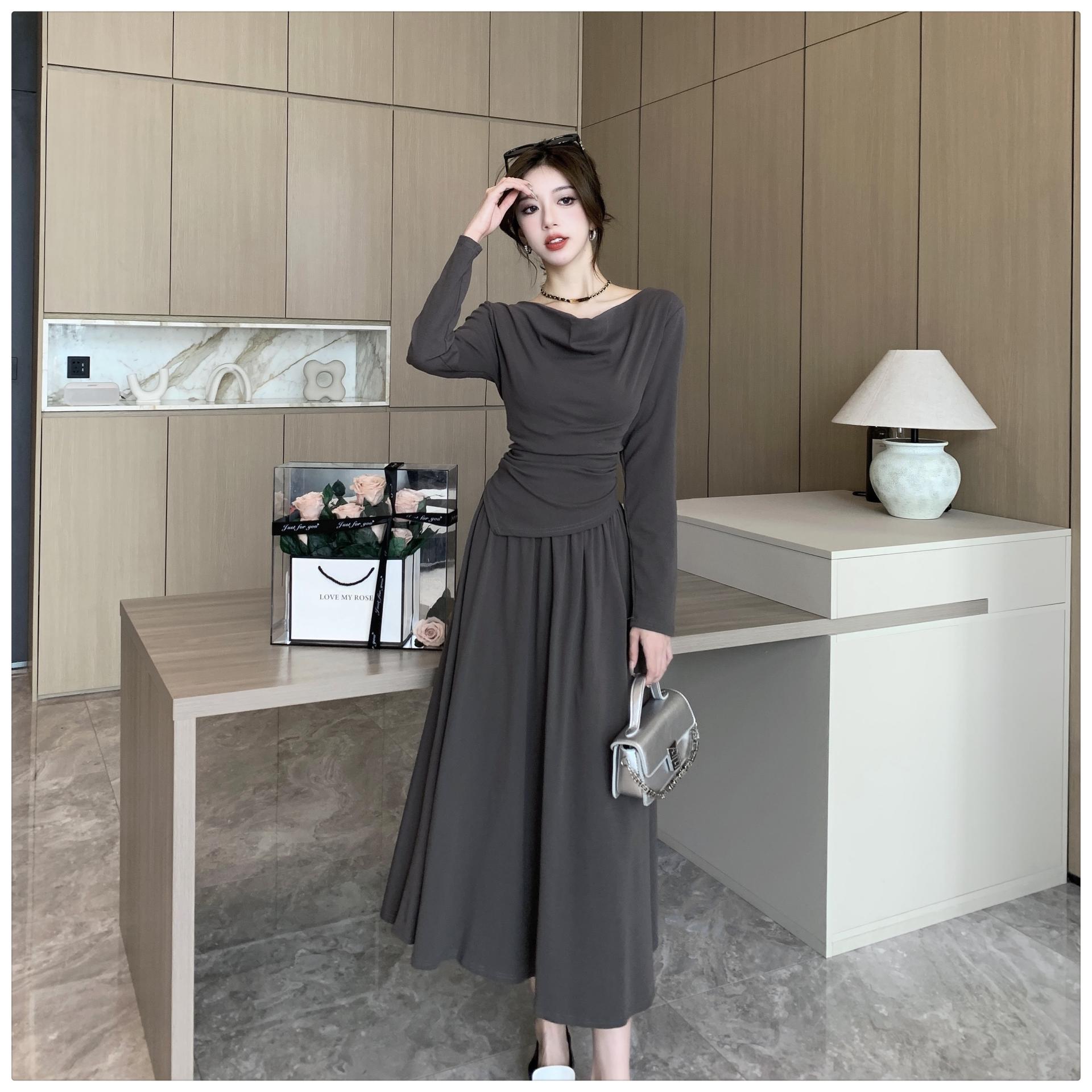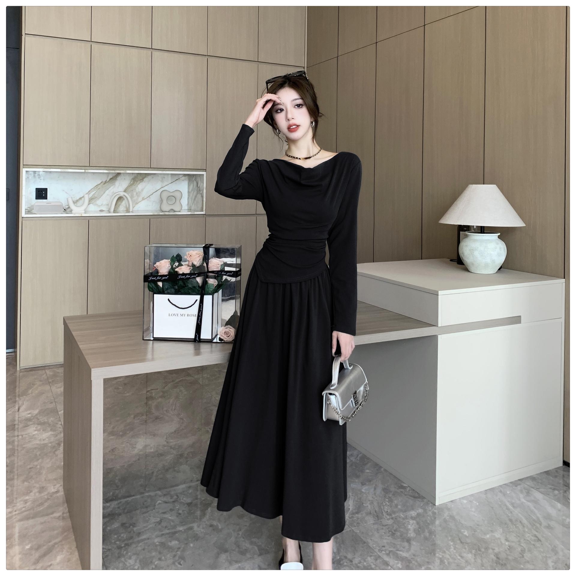 톱은 깔끔한 네크라인의 투피스 세트를 소개합니다.