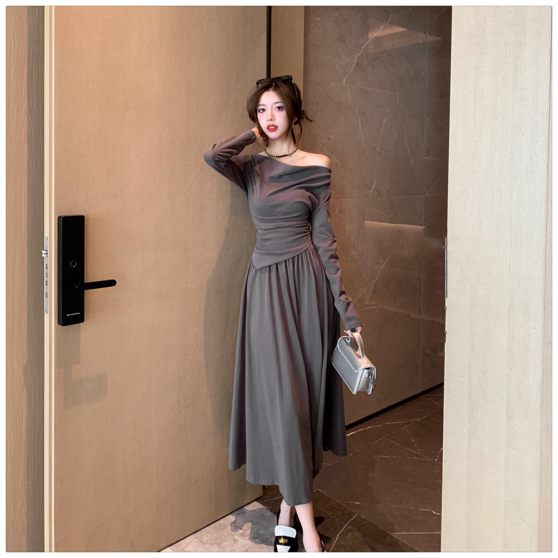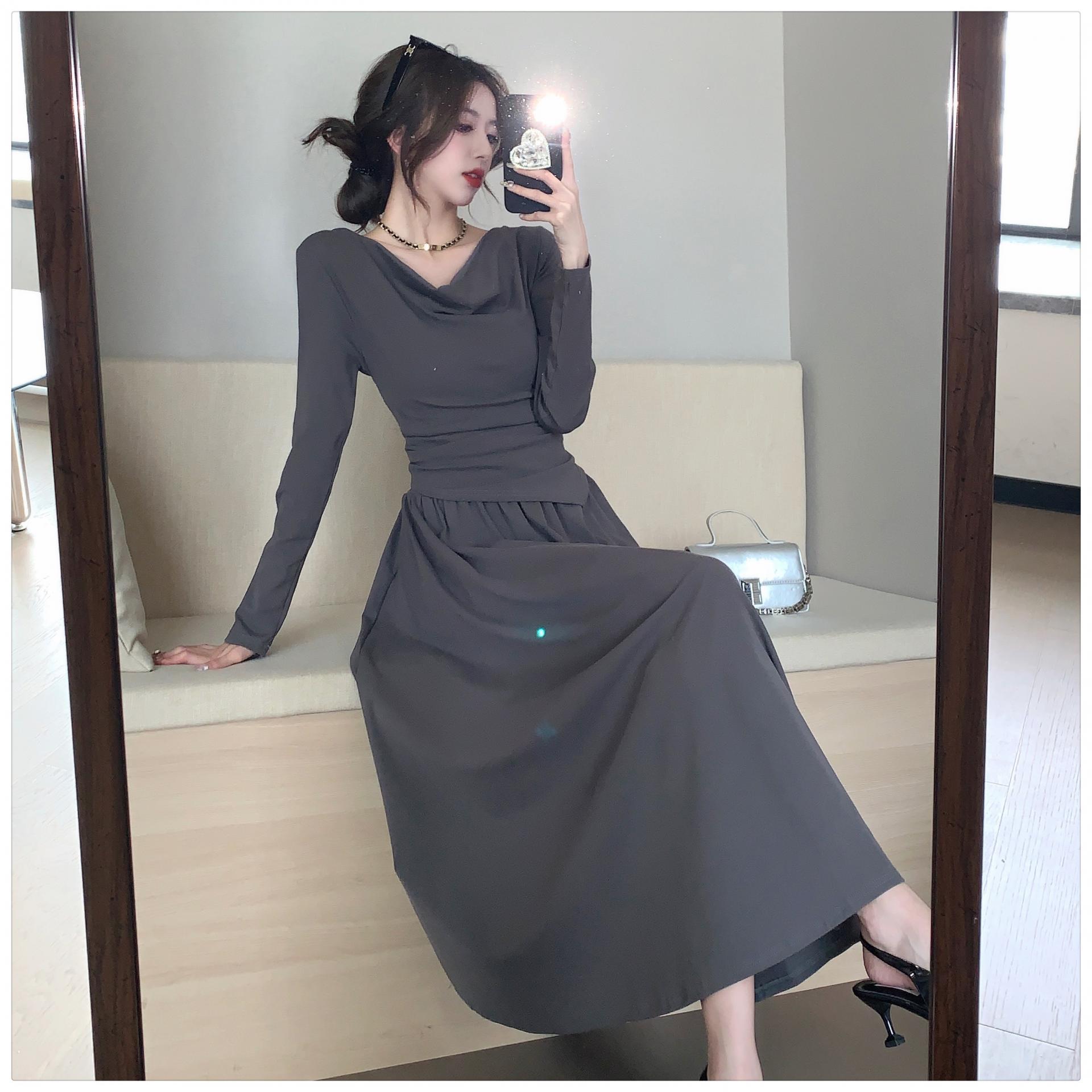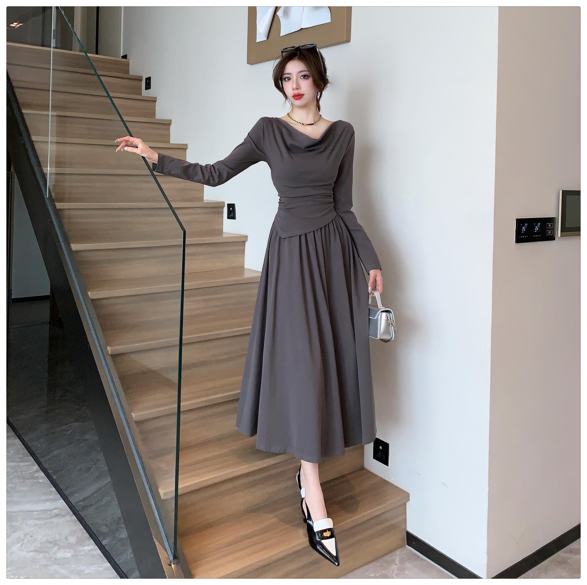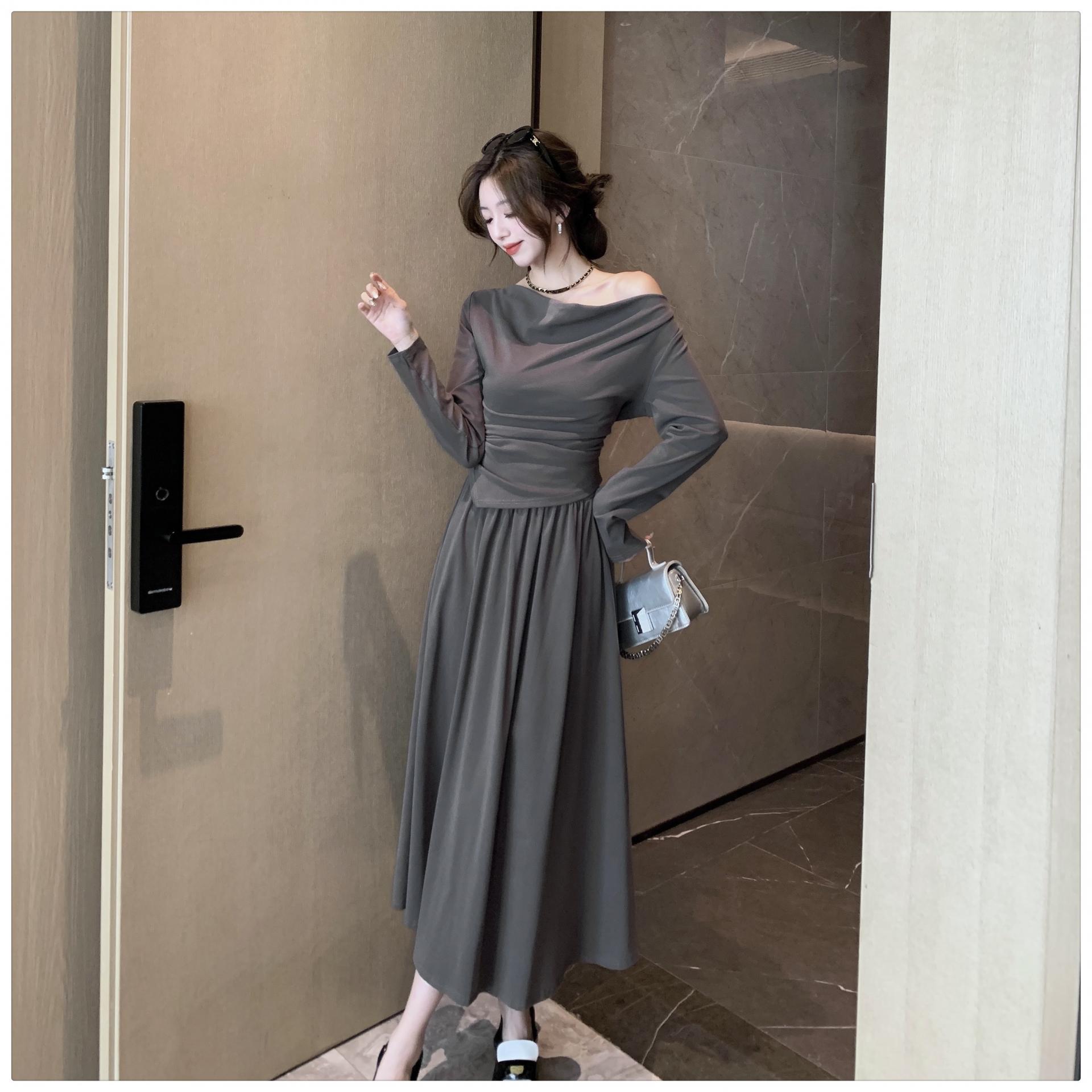 톱은 깔끔한 네크라인의 투피스 세트를 소개합니다.
