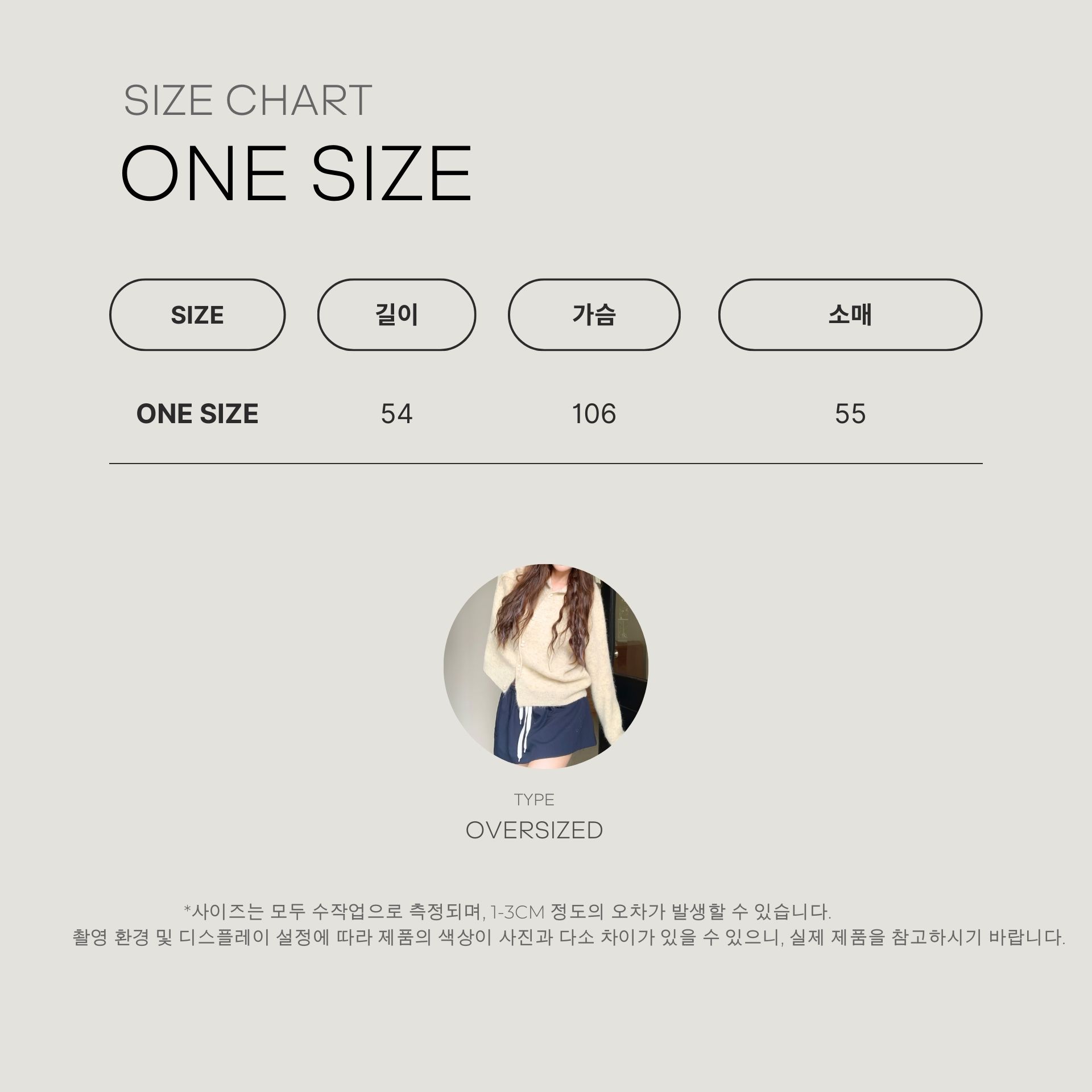 사진과 사이즈가 다른 제품을 받아보셔서 후회하신적 있으시죠? OVERSIZED. 제품은 자체 제작 사이즈로 100% 만족을 보장합니다.